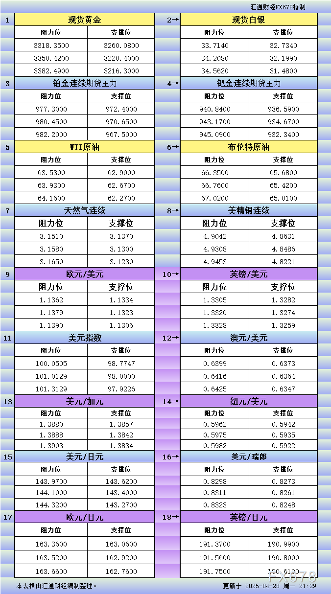 嘉盛外汇官网:4月28日亚市更新支撑阻力:18品种支撑阻力(金银铂钯原油天然气铜
